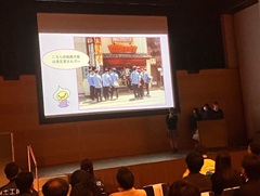 会場には、全国各地で工場夜景観光を推進する行政関係者をはじめ、地域の方々が多数来場されました。生徒たちは大変緊張した様子でしたが、「観光客の宿泊率が20%と低い倉敷市に、夜型観光のあり方を提案したい」という目的のもと、水島の観光資源開発に関する探究学習の成果を堂々と発表しました。発表後には大きな拍手が送られました。