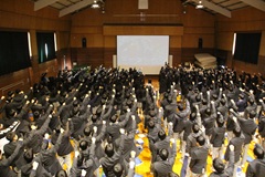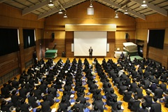 1月15日(木)44期生の大学入学共通テスト激励会を行いました。本校では、大学入学共通テストのことを「藤龍門」と名付けて激励しています。この「藤龍門」は、中国の故事にある「登龍門」の「登」の字を本校の校章に描かれている「藤」に変えた本校独自の言葉で、気品としなやかさをもって大学入試の関門を突破してほしいということを願って付けられました。